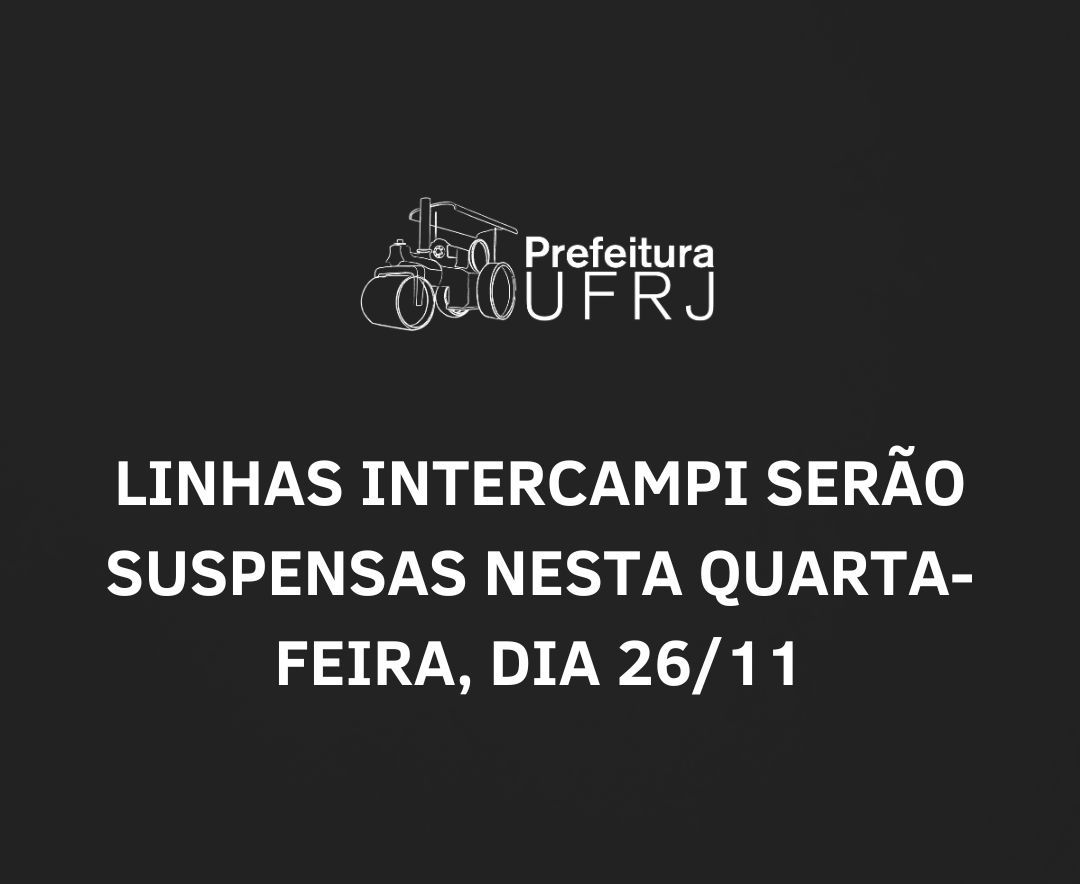 A Prefeitura Universitária informa que, em razão da suspensão das atividades didáticas nesta quarta-feira, 26/11, nos turnos da tarde e noite, no campus localizado na Ilha do Fundão – devido à operação policial realizada no entorno da Cidade Universitária – as linhas intercampi também serão suspensas, exceto a linha que sairá da Praia Vermelha às 15h30 com destino à Cidade Universitária e a linha que sairá da Cidade Universitária com destino à Praça XV às 16h15, trazendo às 17h15 os alunos que retornam dos cursos das unidades do Centro.